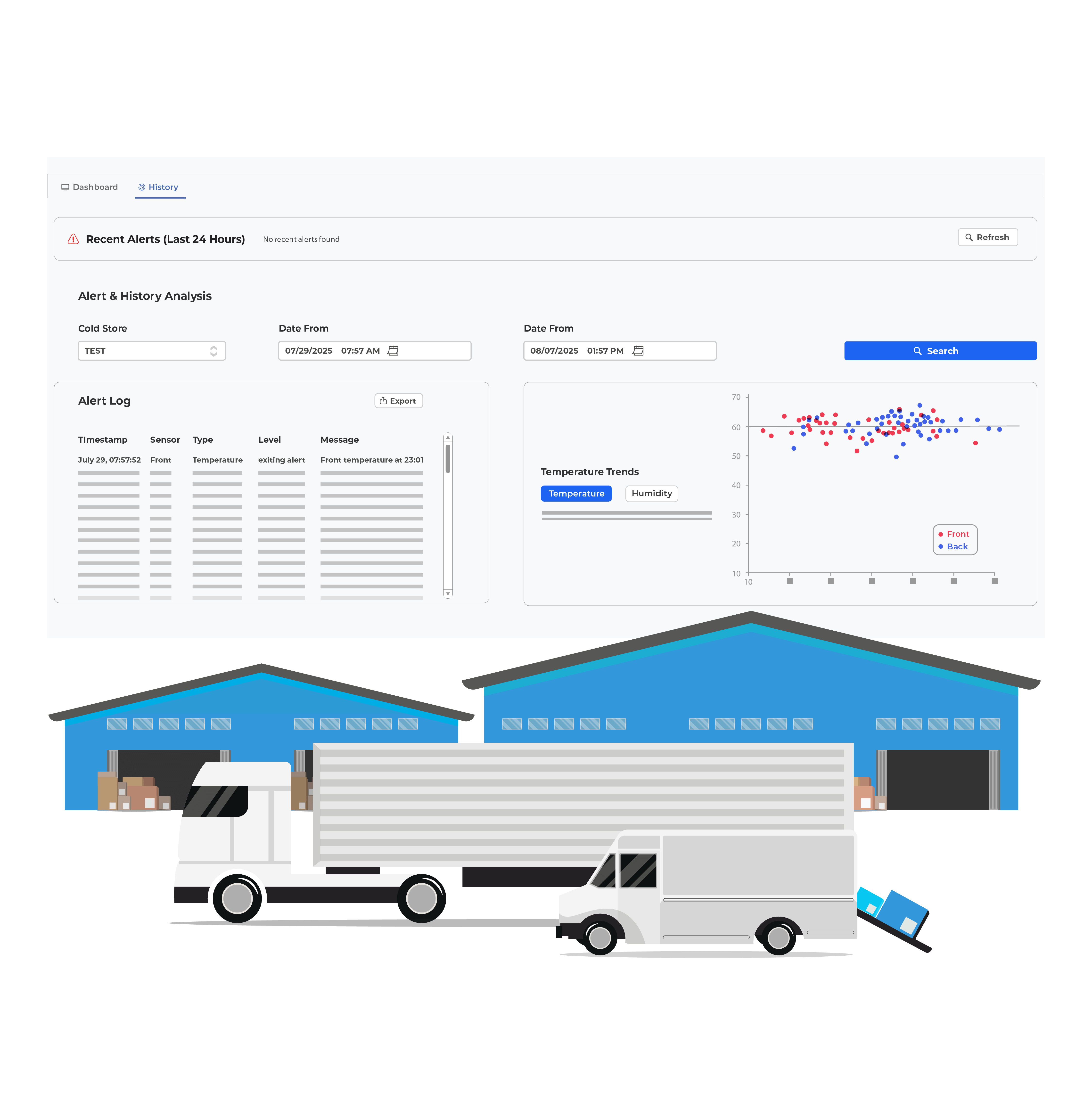 Monitor temperature and humidity in real time across warehouses, trucks, and display units. View continuous readings via mobile or web dashboards to ensure every product stays within safe limits.